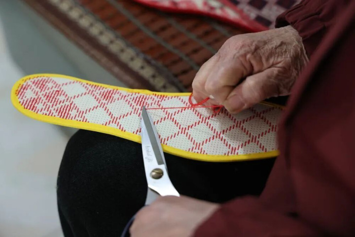 重庆大足,张兴会的家中。72岁的她,戴着老花镜,一针一线,在鞋垫上绣着图案。每天绣四五个小时,五六天才能绣完一双。